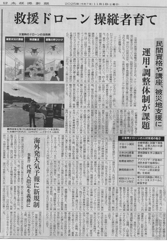 2025年11月1日発行日本経済新聞にドローン減災士協会の取り組みが紹介されました。 ドローンの活用…